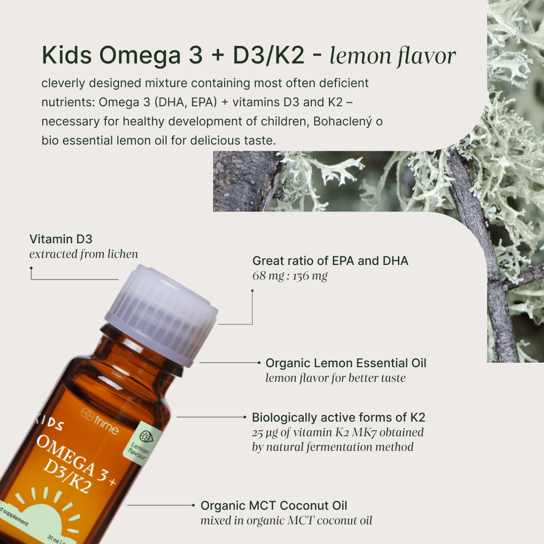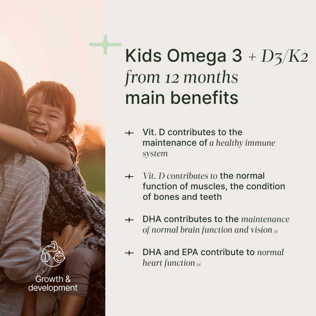Unique formula containing the most deficient nutrients: omega-3 (DHA, EPA) + vitamins D3 and K2, essential for the healthy development of children. Purely from natural plant-based sources.