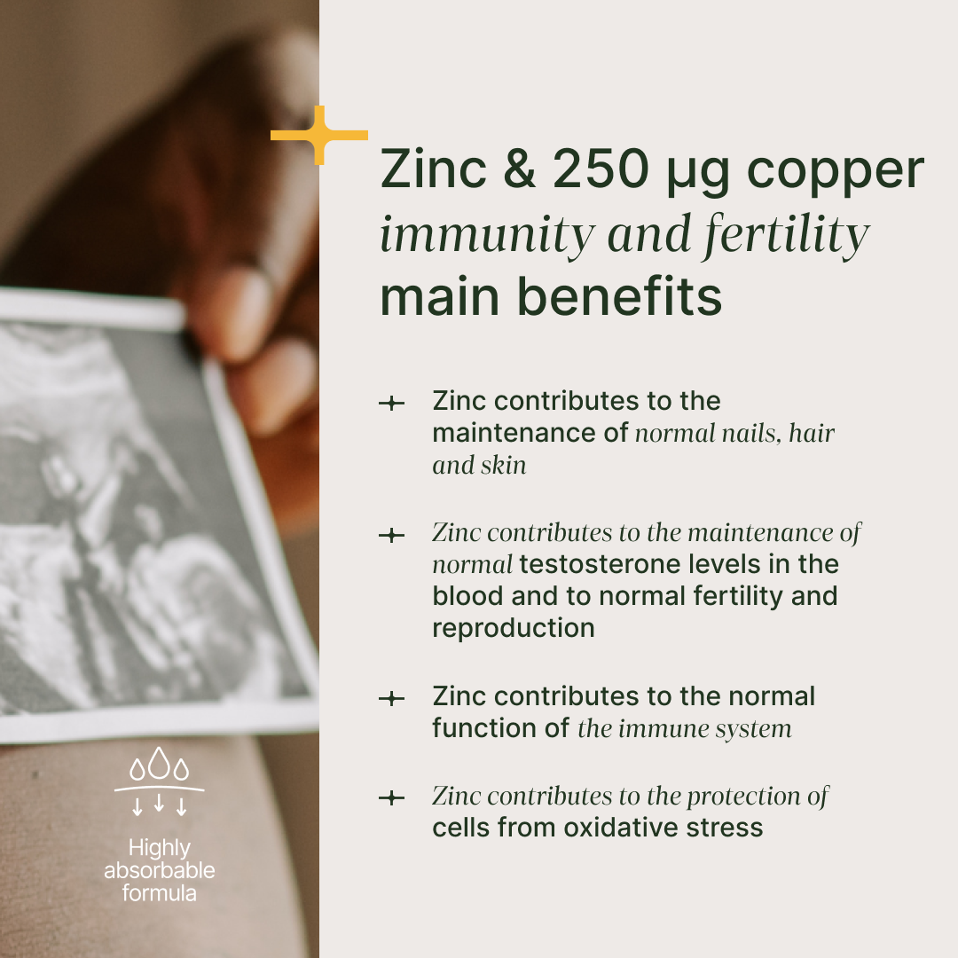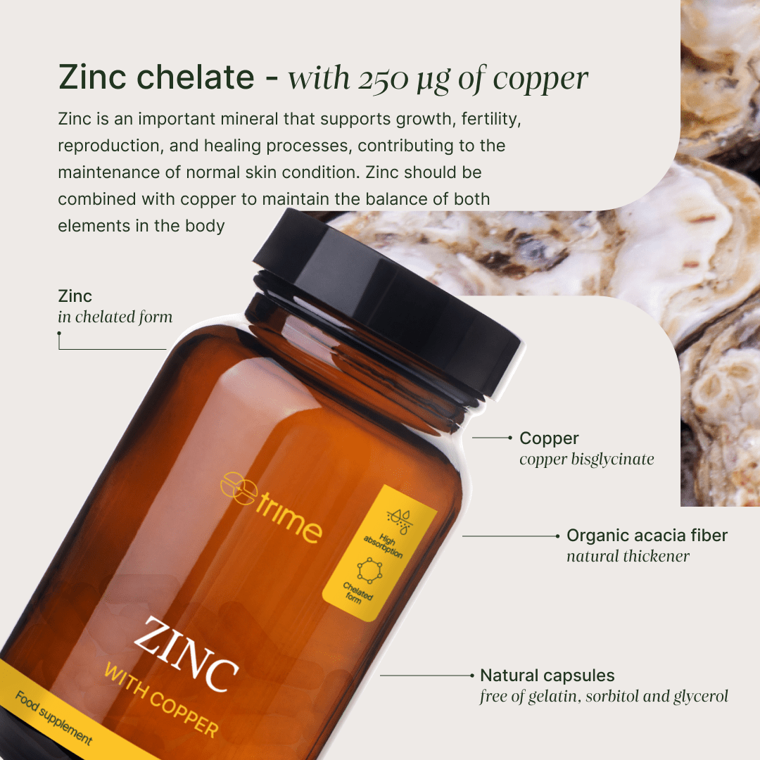 Zinc chelate is the most absorbable form of this important mineral, that supports not only our immune health. In order to maintain the balance of zinc and copper in the human body, we combined both elements in this supplement.